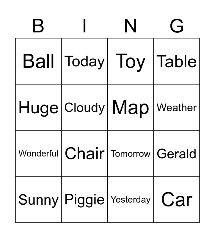 This bingo card has 16 words: Piggie, Gerald, Toy, Ball, Wonderful, Today, Tomorrow, Yesterday, Huge, Cloudy, Sunny, Table, Chair, Weather, Map and Car.