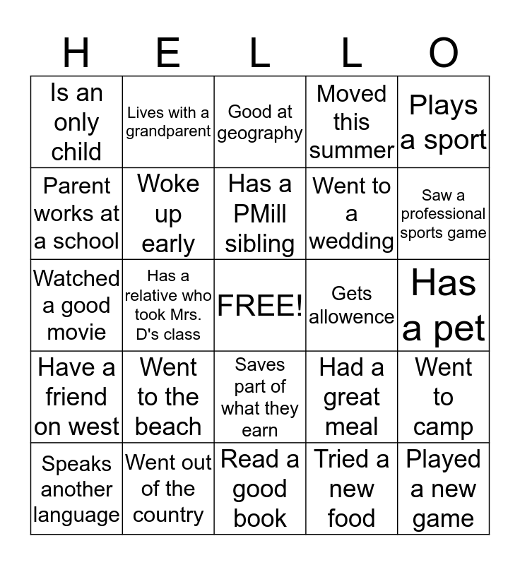 This bingo card has a free space and 24 words: Went to the beach, Went out of the country, Has a PMill sibling, Speaks another language, Plays a sport, Is an only child, Parent works at a school, Lives with a grandparent, Gets allowence, Saves part of what they earn, Went to a wedding, Watched a good movie, Had a great meal, Went to camp, Woke up early, Tried a new food, Has a pet, Good at geography, Saw a professional sports game, Has a relative who took Mrs. D's class, Played a new game, Have a friend on west, Moved this summer and Read a good book.