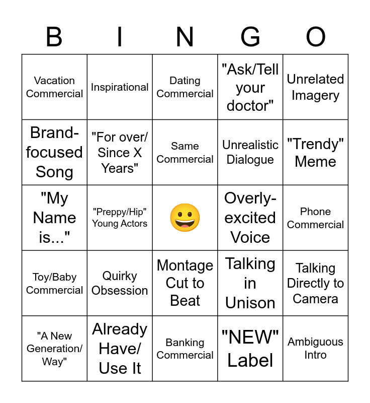 This bingo card has a free space and 38 words: Car-Related Commercial, Inclusive/ Relatable, Fast Food Commercial, "For over/ Since X Years", Talking Directly to Camera, Quirky Obsession, Same Commercial, Popular Song/ Beat, Unrelated Imagery, Unrealistic Dialogue, "Preppy/Hip" Young Actors, "Ask/Tell your doctor", Ambiguous Intro, Phone Commercial, Brand-focused Song, Toy/Baby Commercial, Starts with question, Dating Commercial, Food Commercial, Overly-excited Voice, Vacation Commercial, Already Have/ Use It, "Trendy" Meme, "A New Generation/ Way", House Commercial, Banking Commercial, Fabricated Holiday/Event, Generic Statistic, Imaginary Gatekeeping/ "Some People...", Things That Never Happen, *Casually Repeats Brand Name*, Montage Cut to Beat, "NEW" Label, Inspirational, What If/ Imagine, Talking in Unison, "My Name is..." and Subtly Sexual.