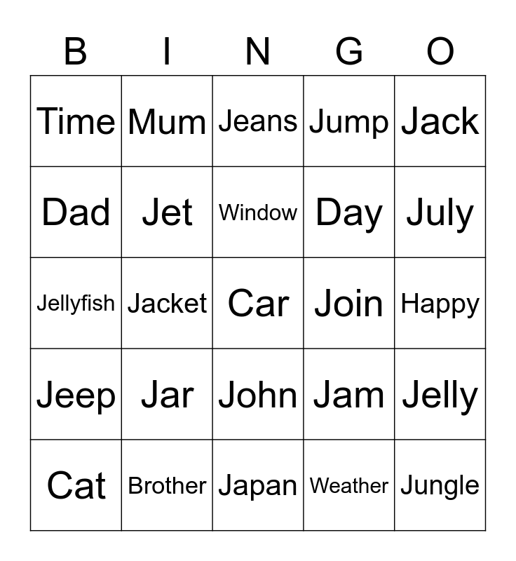This bingo card has a free space and 24 words: Jar, Brother, Window, Cat, Jack, Time, Dad, Mum, Join, John, Day, Jellyfish, Jam, Jelly, Jet, Weather, Happy, Jeans, July, Jacket, Jungle, Jeep, Jump and Japan.