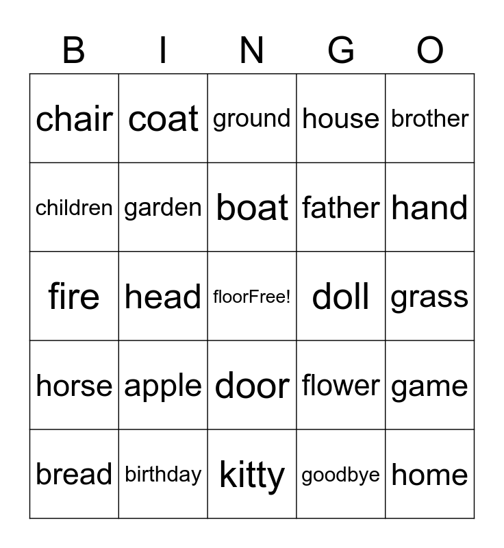 This bingo card has a free space and 24 words: apple, birthday, boat, bread, brother, chair, children, coat, doll, door, father, fire, flower, game, garden, goodbye, grass, ground, hand, head, home, horse, house and kitty.