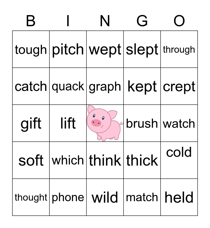 This bingo card has a free space and 24 words: which, phone, graph, thought, through, tough, catch, pitch, brush, think, kept, gift, thick, cold, quack, match, watch, wept, crept, lift, held, soft, slept and wild.