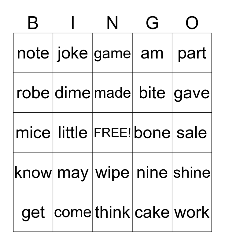 This bingo card has a free space and 24 words: may, come, made, get, part, note, robe, joke, bone, wipe, bite, mice, nine, shine, dime, cake, sale, game, gave, little, work, know, am and think.
