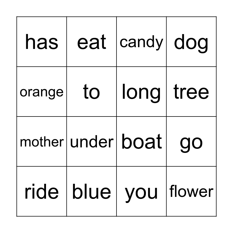 This bingo card has 16 words: blue, go, candy, has, mother, eat, boat, you, orange, to, ride, dog, under, tree, long and flower.