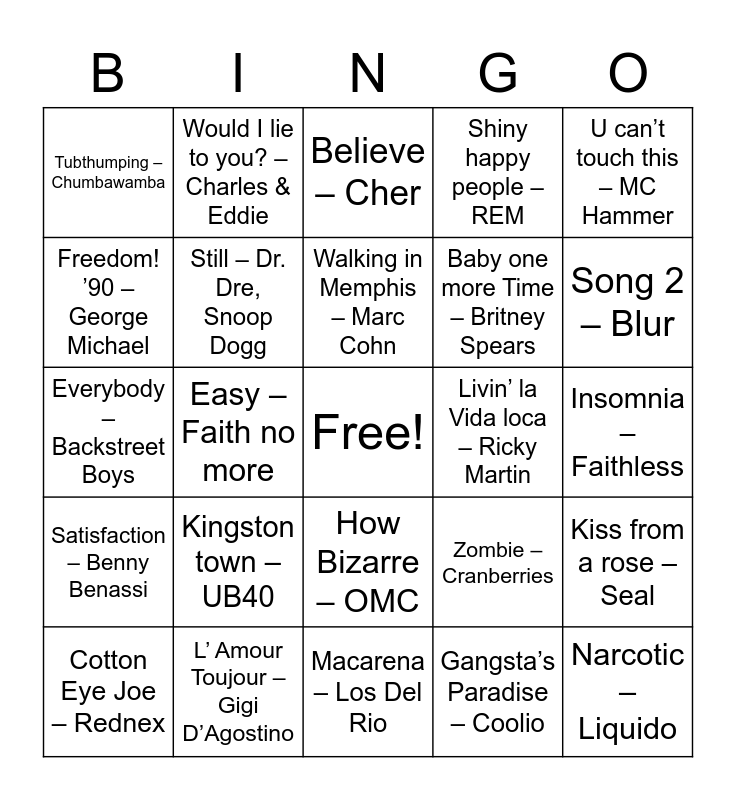 This bingo card has a free space and 60 words: Blue – Eiffel 65, L’ Amour Toujour – Gigi D’Agostino, Sandstorm – Darude, Satisfaction – Benny Benassi, Gangsta’s Paradise – Coolio, Wannabe – Spice Girls, Still – Dr. Dre, Snoop Dogg, I want it that way - Backstreet Boys, Baby one more Time – Britney Spears, I can’t Dance – Genesis, Shiny happy people – REM, Black or White – Michael Jackson, Freedom! ’90 – George Michael, I’ll be there for you – The Rembrandts, Nobody’s Wife – Anouk, Tubthumping – Chumbawamba, Narcotic – Liquido, U can’t touch this – MC Hammer, Fly Away – Lenny Kravitz, Walking in Memphis – Marc Cohn, Livin’ la Vida loca – Ricky Martin, Believe – Cher, Cotton Eye Joe – Rednex, Kiss from a rose – Seal, Man! I feel like a woman – Shania Twain, The rhythm of the night – Corona, It’s my life – Dr Almab, Stars – Simply red, Song 2 – Blur, Ironic – Alanis Morissette, Fading like a flower – Roxette, Be my baby – Vanesse Paradis, Baby, Iove your way – Big Mountain, Jump Around – house of Pain, Would I lie to you? – Charles & Eddie, The sign – Ace of Base, Back for Good – Take That, Easy – Faith no more, All start – Smash mouth, Everybody – Backstreet Boys, Wonderwall – Oasis, Kingston town – UB40, Insomnia – Faithless, I’m outta love – Anastacia, Zombie – Cranberries, Basket Case – Green Day, Vogue – Madonna, Cose della vita – Eros Ramazzotti, Thunderstruck – AC/DC, How Bizarre – OMC, Macarena – Los Del Rio, Picture of you – Boyzone, Mr. Vain – Culture Beat, Getting’ Jiggy With it – Will Smith, Life – Des’ree, Here Comes the Hotstepper – ini Kamoze, Salaam Remix, Mysterious Girl – peter Andre, Bring It All Back – S Club 7, Losing My Religion – REM and Enter Sandman – Metallica.