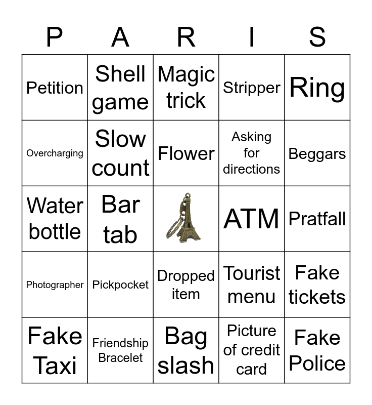 This bingo card has a free space and 24 words: Pickpocket, Friendship Bracelet, Flower, Fake Taxi, Ring, Petition, Overcharging, Shell game, ATM, Dropped item, Asking for directions, Water bottle, Tourist menu, Fake tickets, Slow count, Picture of credit card, Pratfall, Magic trick, Beggars, Bar tab, Fake Police, Photographer, Stripper and Bag slash.
