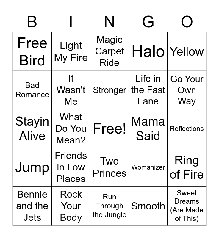 This bingo card has a free space and 49 words: Witchy Woman, Sweet Dreams (Are Made of This), Pump It, Run Through the Jungle, Friends in Low Places, It's Your Thing, Light My Fire, Rehab, Bad Romance, It's Gonna Be Me, It Wasn't Me, Halo, Ring of Fire, Womanizer, Dance, Dance, 24K Magic, Stronger, Mama Said, Bye Bye Bye, Yellow, What Do You Mean?, Smooth, Free Bird, Life in the Fast Lane, Get Off of My Cloud, Go Your Own Way, Bennie and the Jets, Somebody to Love, Two Princes, Jump, Send Me Some Lovin, Sugar, Start Me Up, Mrs. Robinson, Rock Your Body, Suspicious Minds, Johnny B. Goode, Don't Stop The Music, Reflections, I Heard It Through The Grapevine, Smooth Criminal, You Spin Me Round, Is This Love, We Can't Stop, Stayin Alive, Magic Carpet Ride, Tequila, Material Girl and Pour Some Sugar on Me.