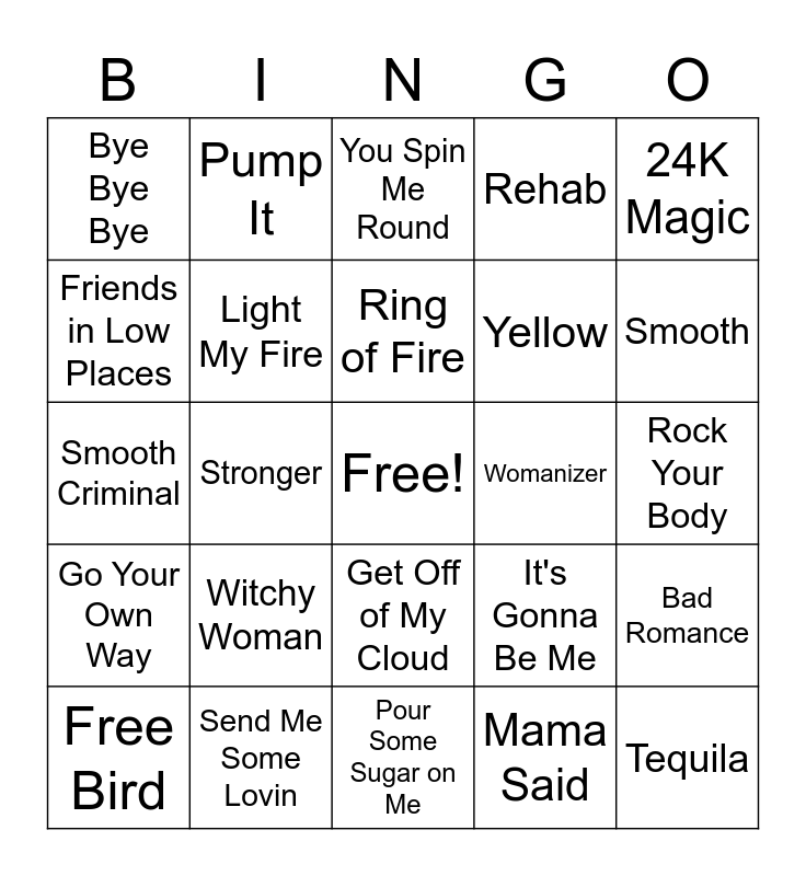 This bingo card has a free space and 49 words: Magic Carpet Ride, Tequila, Material Girl, Pour Some Sugar on Me, Witchy Woman, Sweet Dreams (Are Made of This), Pump It, Run Through the Jungle, Friends in Low Places, It's Your Thing, Light My Fire, Rehab, Bad Romance, It's Gonna Be Me, It Wasn't Me, Halo, Ring of Fire, Womanizer, Dance, Dance, 24K Magic, Stronger, Mama Said, Bye Bye Bye, Yellow, What Do You Mean?, Smooth, Free Bird, Life in the Fast Lane, Get Off of My Cloud, Go Your Own Way, Bennie and the Jets, Somebody to Love, Two Princes, Jump, Send Me Some Lovin, Sugar, Start Me Up, Mrs. Robinson, Rock Your Body, Suspicious Minds, Johnny B. Goode, Don't Stop The Music, Reflections, I Heard It Through The Grapevine, Smooth Criminal, You Spin Me Round, Is This Love, We Can't Stop and Stayin Alive.