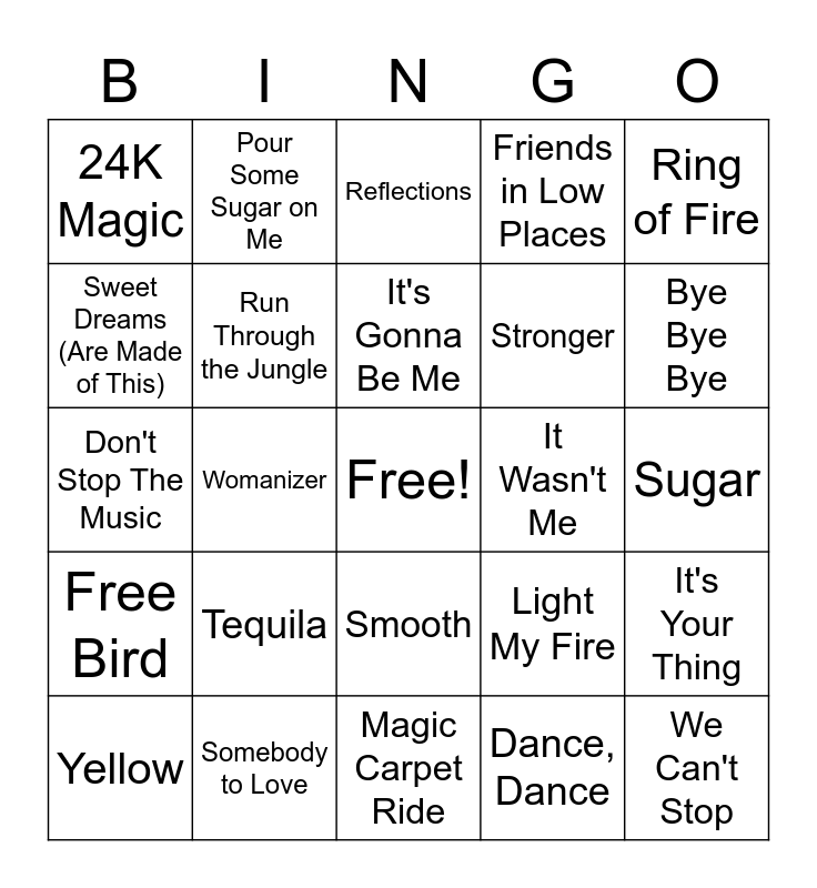This bingo card has a free space and 49 words: Is This Love, We Can't Stop, Stayin Alive, Magic Carpet Ride, Tequila, Material Girl, Pour Some Sugar on Me, Witchy Woman, Sweet Dreams (Are Made of This), Pump It, Run Through the Jungle, Friends in Low Places, It's Your Thing, Light My Fire, Rehab, Bad Romance, It's Gonna Be Me, It Wasn't Me, Halo, Ring of Fire, Womanizer, Dance, Dance, 24K Magic, Stronger, Mama Said, Bye Bye Bye, Yellow, What Do You Mean?, Smooth, Free Bird, Life in the Fast Lane, Get Off of My Cloud, Go Your Own Way, Bennie and the Jets, Somebody to Love, Two Princes, Jump, Send Me Some Lovin, Sugar, Start Me Up, Mrs. Robinson, Rock Your Body, Suspicious Minds, Johnny B. Goode, Don't Stop The Music, Reflections, I Heard It Through The Grapevine, Smooth Criminal and You Spin Me Round.