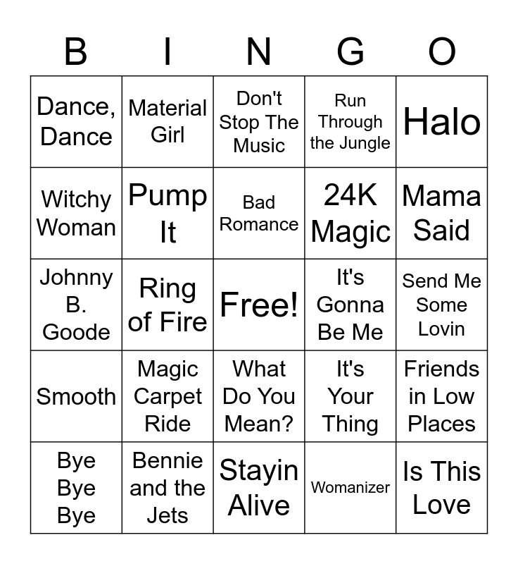 This bingo card has a free space and 49 words: You Spin Me Round, Is This Love, We Can't Stop, Stayin Alive, Magic Carpet Ride, Tequila, Material Girl, Pour Some Sugar on Me, Witchy Woman, Sweet Dreams (Are Made of This), Pump It, Run Through the Jungle, Friends in Low Places, It's Your Thing, Light My Fire, Rehab, Bad Romance, It's Gonna Be Me, It Wasn't Me, Halo, Ring of Fire, Womanizer, Dance, Dance, 24K Magic, Stronger, Mama Said, Bye Bye Bye, Yellow, What Do You Mean?, Smooth, Free Bird, Life in the Fast Lane, Get Off of My Cloud, Go Your Own Way, Bennie and the Jets, Somebody to Love, Two Princes, Jump, Send Me Some Lovin, Sugar, Start Me Up, Mrs. Robinson, Rock Your Body, Suspicious Minds, Johnny B. Goode, Don't Stop The Music, Reflections, I Heard It Through The Grapevine and Smooth Criminal.