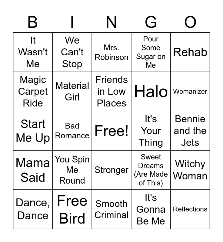 This bingo card has a free space and 49 words: Don't Stop The Music, Reflections, I Heard It Through The Grapevine, Smooth Criminal, You Spin Me Round, Is This Love, We Can't Stop, Stayin Alive, Magic Carpet Ride, Tequila, Material Girl, Pour Some Sugar on Me, Witchy Woman, Sweet Dreams (Are Made of This), Pump It, Run Through the Jungle, Friends in Low Places, It's Your Thing, Light My Fire, Rehab, Bad Romance, It's Gonna Be Me, It Wasn't Me, Halo, Ring of Fire, Womanizer, Dance, Dance, 24K Magic, Stronger, Mama Said, Bye Bye Bye, Yellow, What Do You Mean?, Smooth, Free Bird, Life in the Fast Lane, Get Off of My Cloud, Go Your Own Way, Bennie and the Jets, Somebody to Love, Two Princes, Jump, Send Me Some Lovin, Sugar, Start Me Up, Mrs. Robinson, Rock Your Body, Suspicious Minds and Johnny B. Goode.
