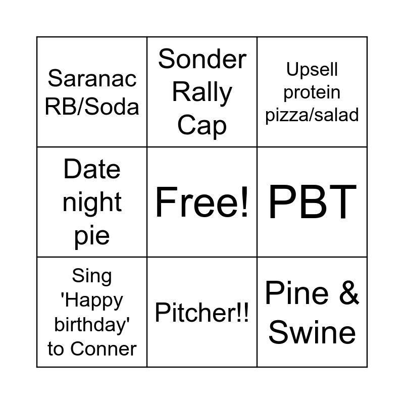 This bingo card has a free space and 8 words: PBT, Upsell protein pizza/salad, Sonder Rally Cap, Sing 'Happy birthday' to Conner, Saranac RB/Soda, Pine & Swine, Date night pie and Pitcher!!.
