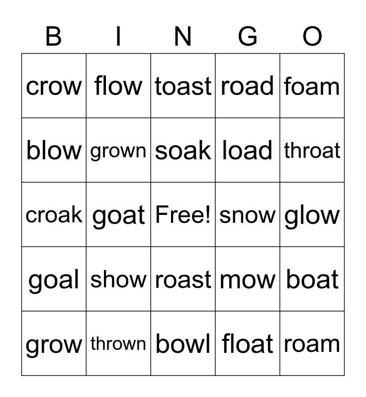 This bingo card has a free space and 28 words: boat, low, load, float, blow, toast, flow, goal, snow, grow, croak, road, thrown, bowl, throat, oak, show, grown, soak, roast, crow, slow, roam, goat, glow, mow, foam and soap.
