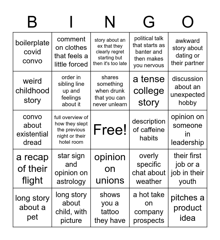 This bingo card has a free space and 24 words: star sign and opinion on astrology, long story about child, with picture, shares something when drunk that you can never unlearn, long story about a pet, awkward story about dating or their partner, boilerplate covid convo, weird childhood story, comment on clothes that feels a little forced, description of caffeine habits, opinion on unions, a tense college story, convo about existential dread, overly specific chat about weather, their first job or a job in their youth, order in sibling line up and feelings about it, a hot take on company prospects, opinion on someone in leadership, story about an ex that they clearly regret starting but then it's too late, discussion about an unexpected hobby, full overview of how they slept the previous night or their hotel room, pitches a product idea, a recap of their flight, political talk that starts as banter and then makes you nervous and shows you a tattoo they have.