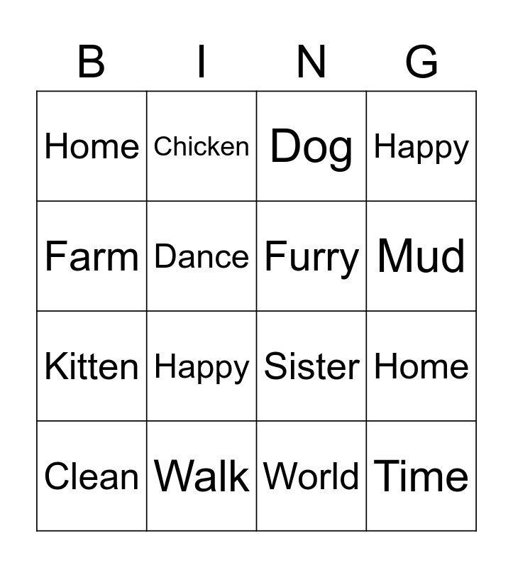 This bingo card has 24 words: Black, Jump, Mud, Girl, Farm, Home, Dance, Chicken, Walk, Spot, Kitten, Sister, Dirty, Monster, Furry, Explore, World, Dog, Happy, Home, Clean, Time, Happy and World.