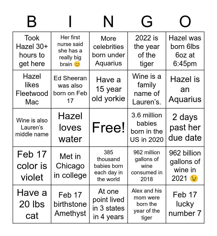 This bingo card has a free space and 25 words: Met in Chicago in college, At one point lived in 3 states in 4 years, Have a 15 year old yorkie, Have a 20 lbs cat, Hazel was born 6lbs 6oz at 6:45pm, Took Hazel 30+ hours to get here, Hazel likes Fleetwood Mac, Her first nurse said she has a really big brain 😊, 3.6 million babies born in the US in 2020, 385 thousand babies born each day in the world, Wine is a family name of Lauren’s., Wine is also Lauren’s middle name, 962 million gallons of wine consumed in 2018, 962 billion gallons of wine in 2021 😉, Ed Sheeran was also born on Feb 17, February 17th, 2 days past her due date, More celebrities born under Aquarius, Hazel is an Aquarius, Hazel loves water, Feb 17 lucky number 7, Feb 17 birthstone Amethyst, Feb 17 color is violet, 2022 is the year of the tiger and Alex and his mom were born the year of the tiger.