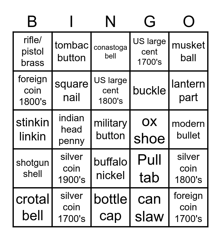 This bingo card has 25 words: silver coin 1900's, bottle cap, US large cent 1800's, crotal bell, musket ball, rifle/ pistol brass, foreign coin 1800's, tombac button, ox shoe, buffalo nickel, buckle, stinkin linkin, Pull tab, silver coin 1800's, square nail, foreign coin 1700's, modern bullet, conastoga bell, lantern part, indian head penny, military button, silver coin 1700's, shotgun shell, US large cent 1700's and can slaw.