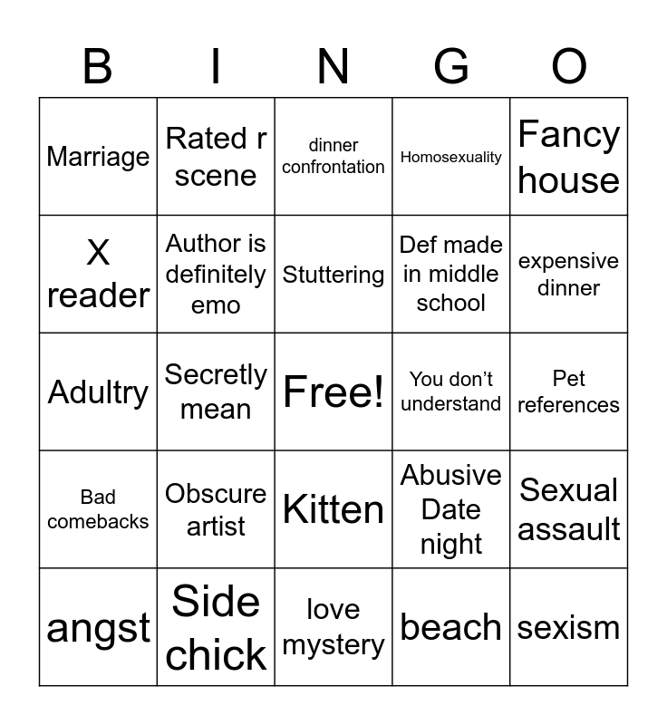 This bingo card has a free space and 45 words: abuse, sexism, blonde, angst, expensive car, beach, dinner confrontation, love triangle, Fancy house, Side chick, Homosexuality, You don’t understand, Kitten, Obscure artist, unfinished, love mystery, Murder, Adultry, suit, expensive dinner, Rated r scene, hands, choking, Marriage, Secret child, Pet references, Nude scene, Age difference, Abusive Date night, Bad comebacks, Cartoon supervillain, Sexual assault, Childhood bsf, Not like other girls, Stalker, Secretly mean, Secretly kind, Mc trips, Expected reveal, Stuttering, X reader, Def made in middle school, Author does face reveal, Author is definitely emo and Emotionless.