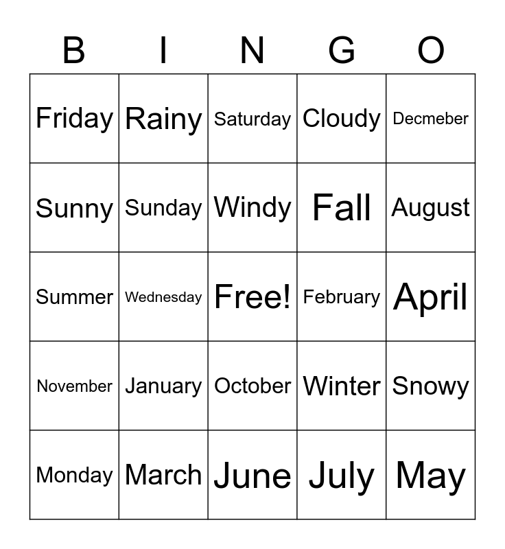 This bingo card has a free space and 29 words: Monday, Tuesday, Wednesday, Thursday, Friday, Saturday, Sunday, January, February, March, April, May, June, July, August, September, October, November, Decmeber, Summer, Winter, Spring, Fall, Sunny, Cloudy, Rainy, Snowy, Windy and Hot.