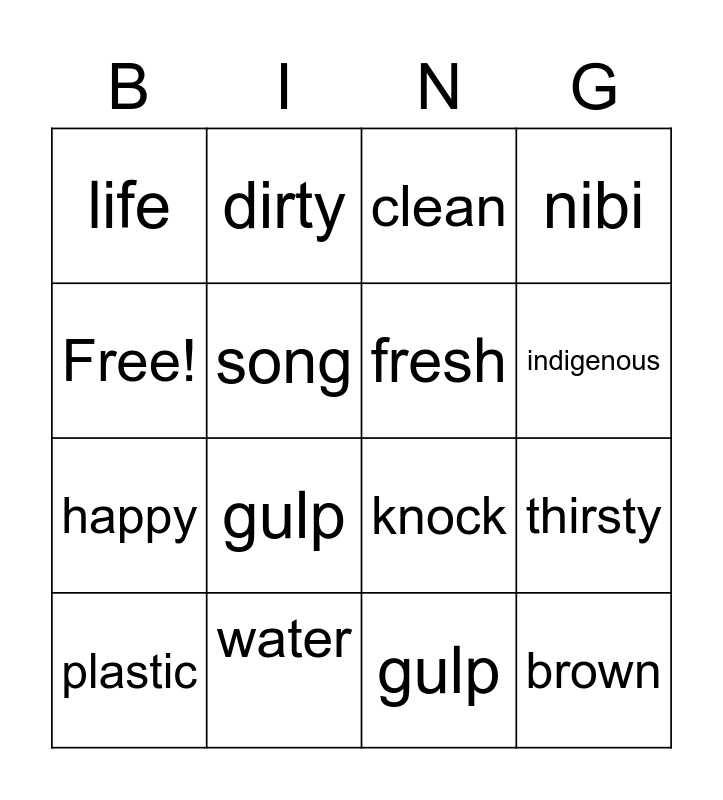 This bingo card has 16 words: water, thirsty, clean, life, happy, dirty, knock, gulp, Free!, song, plastic, nibi, gulp, indigenous, fresh and brown.