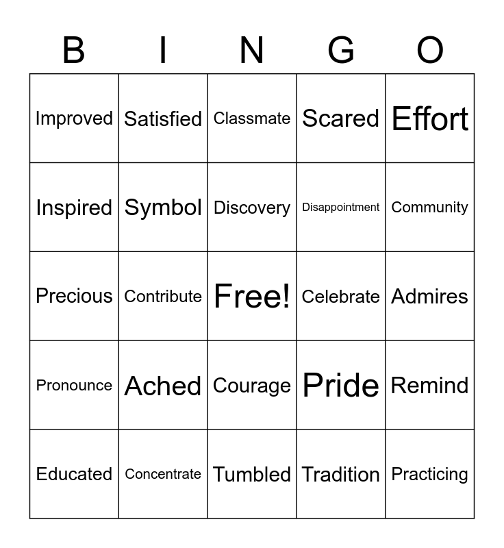 This bingo card has a free space and 24 words: Ached, Concentrate, Discovery, Educated, Effort, Improved, Inspired, Satisfied, Celebrate, Courage, Disappointment, Precious, Pride, Remind, Symbol, Tradition, Admires, Classmate, Community, Contribute, Practicing, Pronounce, Scared and Tumbled.