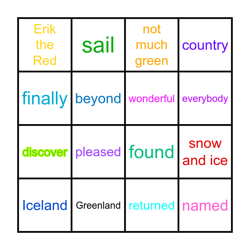 This bingo card has 16 words: Greenland, snow and ice, not much green, Erik the Red, discover, sail, found, returned, finally, beyond, Iceland, country, pleased, everybody, wonderful and named.