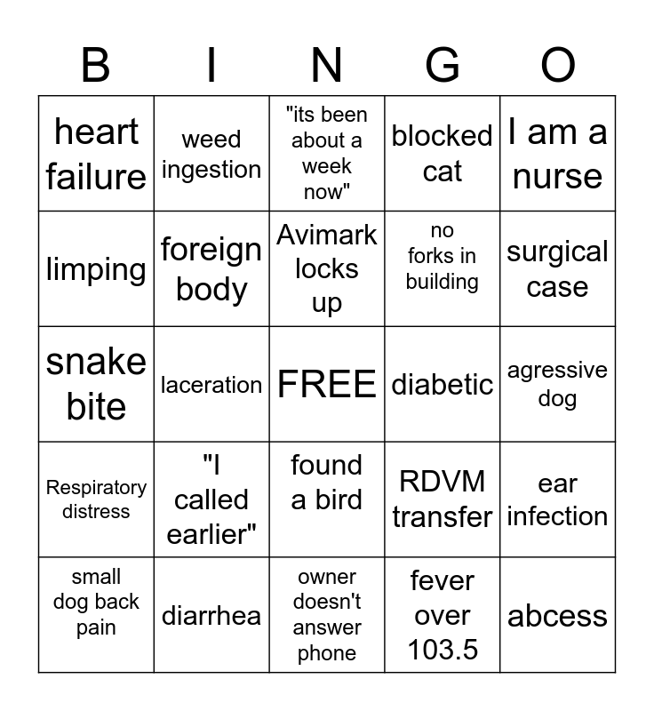 This bingo card has a free space and 24 words: "I called earlier", diarrhea, Avimark locks up, small dog back pain, I am a nurse, heart failure, limping, weed ingestion, diabetic, found a bird, no forks in building, snake bite, RDVM transfer, ear infection, foreign body, fever over 103.5, agressive dog, "its been about a week now", surgical case, laceration, abcess, Respiratory distress, blocked cat and owner doesn't answer phone.