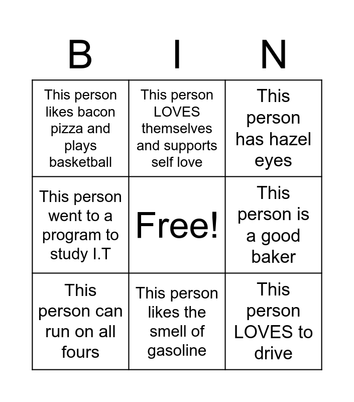 This bingo card has a free space and 19 words: This person hates their job, This person does NOT like pizza or chocolate, This person has hazel eyes, This person is from Ethiopia, This person can speak 3 languages, This person LOVES to drive, This person cooks to help with their anger, This person likes bacon pizza and plays basketball, This person LOVES themselves and supports self love, This person's favorite song to play and sing on guitar is Colapso by Kevin Kaarl, This person just started taking boxing classes, This person is a good baker, This person can run on all fours, This person plays volleyball, This person believes they are the perfect cook, This person considers themselves to be an empath (understanding of others emotions), This person went to a program to study I.T, This person likes the smell of gasoline and This person is going to learn how to ride a motorcycle soon.