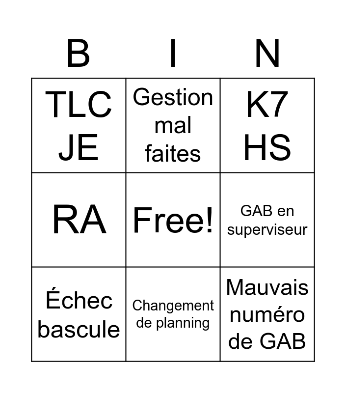 This bingo card has a free space and 8 words: GAB en superviseur, K7 HS, Gestion mal faites, Échec bascule, TLC JE, Mauvais numéro de GAB, RA and Changement de planning.