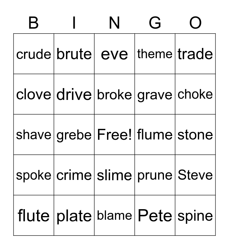 This bingo card has a free space and 24 words: crime, plate, broke, flute, trade, crude, clove, brute, flume, slime, grave, shave, prune, Steve, drive, Pete, stone, eve, choke, grebe, spine, spoke, theme and blame.