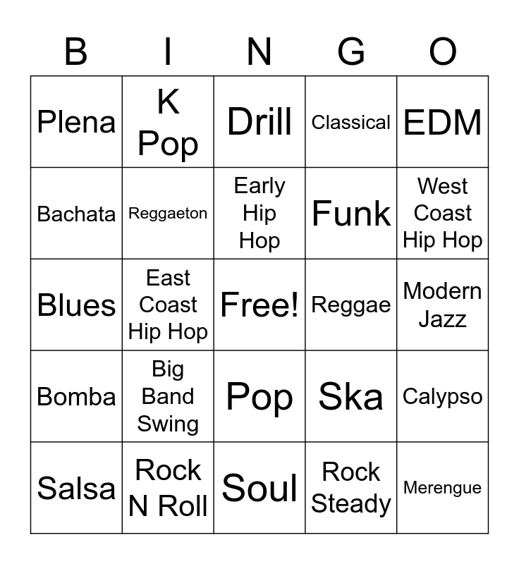This bingo card has a free space and 24 words: Big Band Swing, Rock N Roll, Early Hip Hop, Salsa, EDM, Plena, Bachata, K Pop, Reggae, Pop, Funk, Blues, Ska, Calypso, Reggaeton, Rock Steady, Modern Jazz, Drill, West Coast Hip Hop, East Coast Hip Hop, Merengue, Bomba, Classical and Soul.