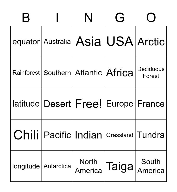 This bingo card has a free space and 24 words: Pacific, Antarctica, Atlantic, longitude, Arctic, equator, Rainforest, Australia, Europe, Indian, Africa, latitude, Grassland, Tundra, Southern, Taiga, France, Asia, Deciduous Forest, Desert, South America, Chili, USA and North America.