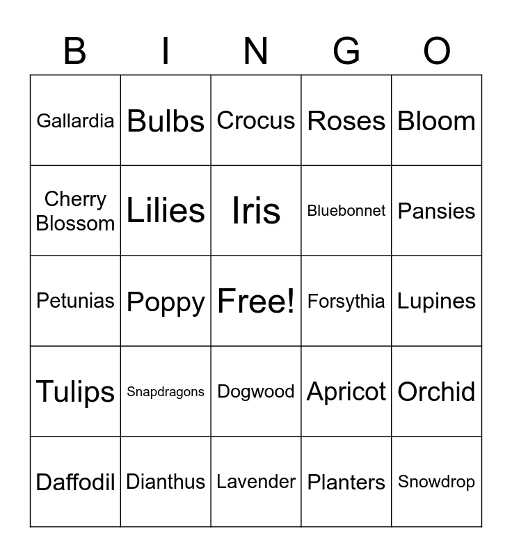 This bingo card has a free space and 34 words: Picnics, Planters, Gardening, Flowers, Tulips, Lilies, Bloom, Daffodil, Bulbs, Magnolia, Iris, Crocus, Hyacinth, Azalea, Forsythia, Pansies, Dianthus, Petunias, Snapdragons, Apricot, Dogwood, Gazania, Gallardia, Lupines, Lavender, Snowdrop, Roses, Daisy, Bluebonnet, Cherry Blossom, SunFlower, Poppy, Orchid and Bird of Paradise.