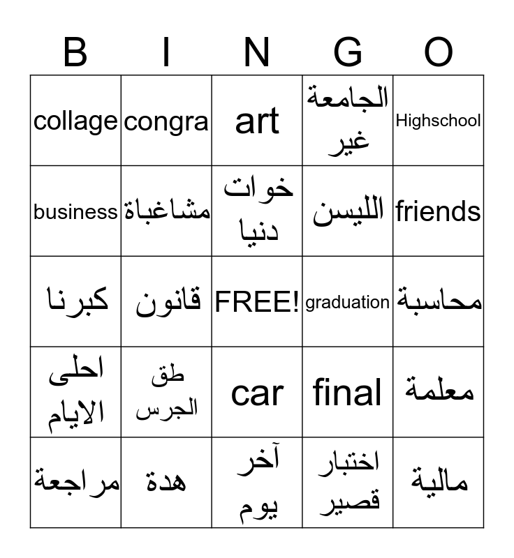 This bingo card has a free space and 24 words: طق الجرس, هدة, خوات دنيا, مراجعة, Highschool, collage, business, congra, graduation, car, الليسن, كبرنا, final, معلمة, مشاغباة, اختبار قصير, محاسبة, art, friends, قانون, مالية, احلى الايام, الجامعة غير and آخر يوم.