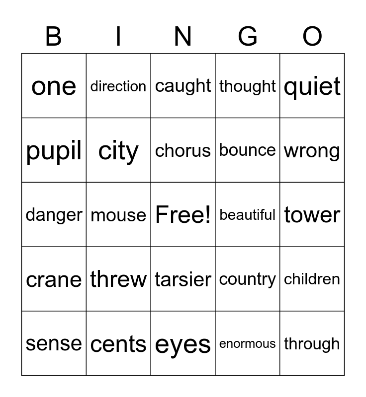 This bingo card has a free space and 36 words: learn, agree, protect, city, country, crane, chorus, weather, quiet, quite, mouse, thought, though, beautiful, wrong, one, won, threw, through, caught, tower, children, cents, sense, eyes, direction, danger, tongue, bounce, pupil, light, nectar, enormous, tarsier, patterns and search.