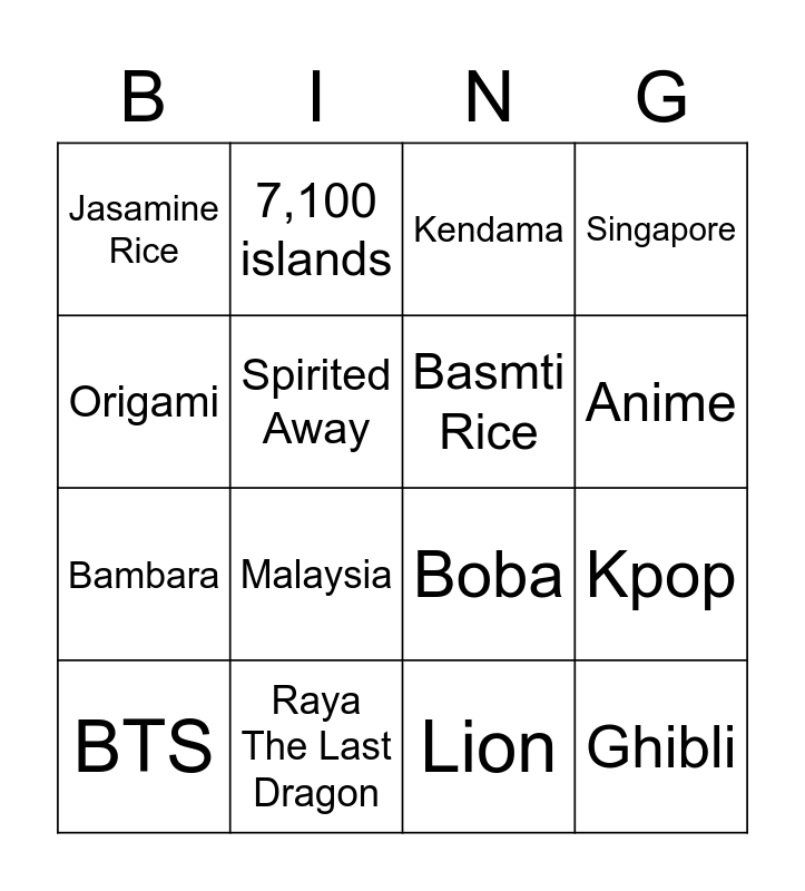 This bingo card has 16 words: Raya The Last Dragon, Kpop, Kendama, Jasamine Rice, Bambara, 7,100 islands, Boba, Lion, Origami, Spirited Away, BTS, Singapore, Malaysia, Anime, Basmti Rice and Ghibli.