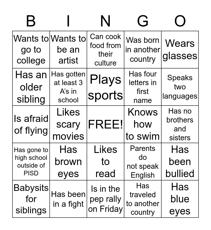 This bingo card has a free space and 24 words: Has brown eyes, Has been in a fight, Plays sports, Babysits for siblings, Wears glasses, Wants to go to college, Has an older sibling, Wants to be an artist, Knows how to swim, Likes to read, Has four letters in first name, Is afraid of flying, Parents do not speak English, Has been bullied, Has gotten at least 3 A’s in school, Has traveled to another country, Has no brothers and sisters, Can cook food from their culture, Speaks two languages, Likes scary movies, Has blue eyes, Has gone to high school outside of PISD, Was born in another country and Is in the pep rally on Friday.