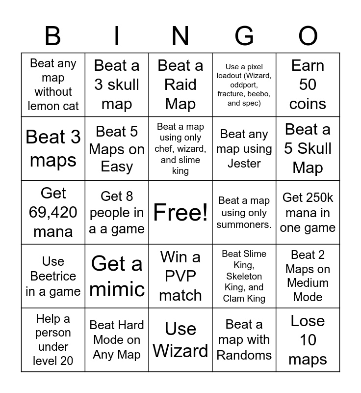 This bingo card has a free space and 24 words: Get a mimic, Beat Hard Mode on Any Map, Beat a map using only chef, wizard, and slime king, Help a person under level 20, Earn 50 coins, Beat any map without lemon cat, Beat 3 maps, Beat a 3 skull map, Beat a map using only summoners., Win a PVP match, Beat any map using Jester, Get 69,420 mana, Beat Slime King, Skeleton King, and Clam King, Beat 2 Maps on Medium Mode, Beat 5 Maps on Easy, Beat a map with Randoms, Get 250k mana in one game, Beat a Raid Map, Beat a 5 Skull Map, Get 8 people in a a game, Lose 10 maps, Use Beetrice in a game, Use a pixel loadout (Wizard, oddport, fracture, beebo, and spec) and Use Wizard.