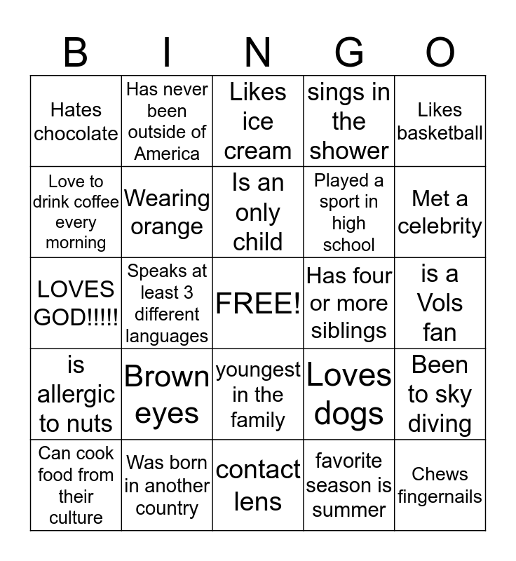This bingo card has a free space and 24 words: Brown eyes, Was born in another country, Is an only child, Can cook food from their culture, Likes basketball, Hates chocolate, Love to drink coffee every morning, Has never been outside of America, Has four or more siblings, youngest in the family, Played a sport in high school, LOVES GOD!!!!!, Loves dogs, Been to sky diving, Wearing orange, favorite season is summer, is a Vols fan, Likes ice cream, Met a celebrity, Speaks at least 3 different languages, Chews fingernails, is allergic to nuts, sings in the shower and contact lens.