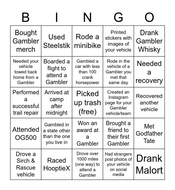 This bingo card has a free space and 24 words: Gambled in a state other than the one you live in, Raced HooptieX, Gambled a car with less than 100 crank horsepower, Drove a Sirch & Rascue vehicle, Drank Gambler Whisky, Bought Gambler merch, Needed your vehicle towed back home from a Gambler, Used Steelstik, Created an Instagram page for your Gambler vehicle/team, Won an award at a Gambler, Rode in the vehicle of a Gambler you met that same day, Performed a successful trail repair, Brought a friend to their first Gambler, Met Godfather Tate, Boarded a flight to attend a Gambler, Had strangers post photos of your vehicle on social media, Recovered another vehicle, Rode a minibike, Needed a recovery, Arrived at camp after midnight, Drank Malort, Attended OG500, Printed stickers with images of your vehicle and Drove over 1000 miles (one way) to attend a Gambler.