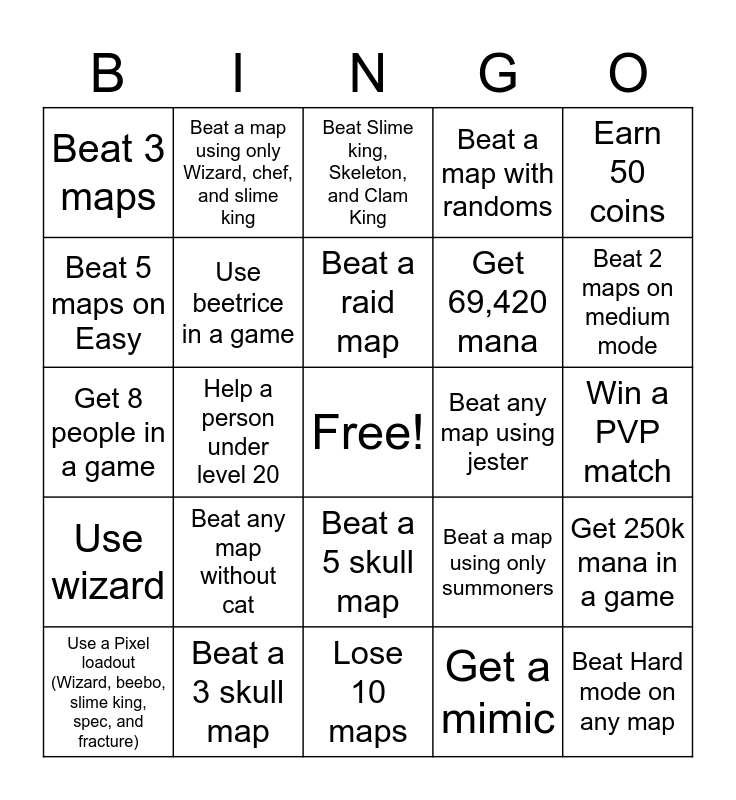 This bingo card has a free space and 24 words: Beat any map without cat, Beat a 3 skull map, Beat a raid map, Use a Pixel loadout (Wizard, beebo, slime king, spec, and fracture), Earn 50 coins, Beat 3 maps, Beat 5 maps on Easy, Beat a map using only Wizard, chef, and slime king, Beat any map using jester, Beat a 5 skull map, Get 69,420 mana, Get 8 people in a game, Beat a map using only summoners, Get 250k mana in a game, Use beetrice in a game, Get a mimic, Win a PVP match, Beat Slime king, Skeleton, and Clam King, Beat 2 maps on medium mode, Help a person under level 20, Beat Hard mode on any map, Use wizard, Beat a map with randoms and Lose 10 maps.