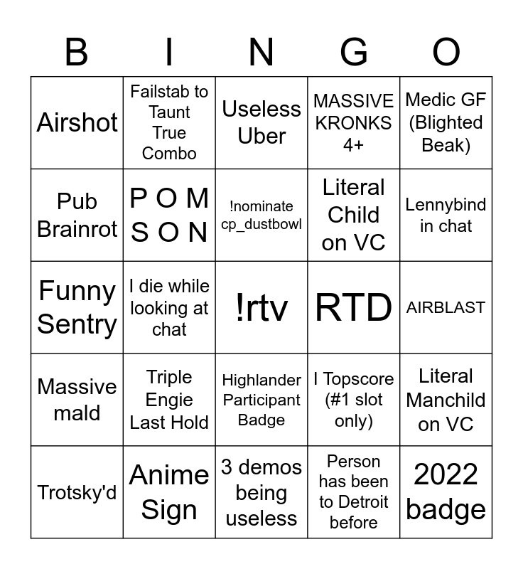 This bingo card has a free space and 24 words: Triple Engie Last Hold, Anime Sign, !nominate cp_dustbowl, Trotsky'd, Medic GF (Blighted Beak), Airshot, Pub Brainrot, Failstab to Taunt True Combo, RTD, Highlander Participant Badge, Literal Child on VC, Funny Sentry, I Topscore (#1 slot only), Literal Manchild on VC, P O M S O N, Person has been to Detroit before, AIRBLAST, Useless Uber, Lennybind in chat, I die while looking at chat, 2022 badge, Massive mald, MASSIVE KRONKS 4+ and 3 demos being useless.