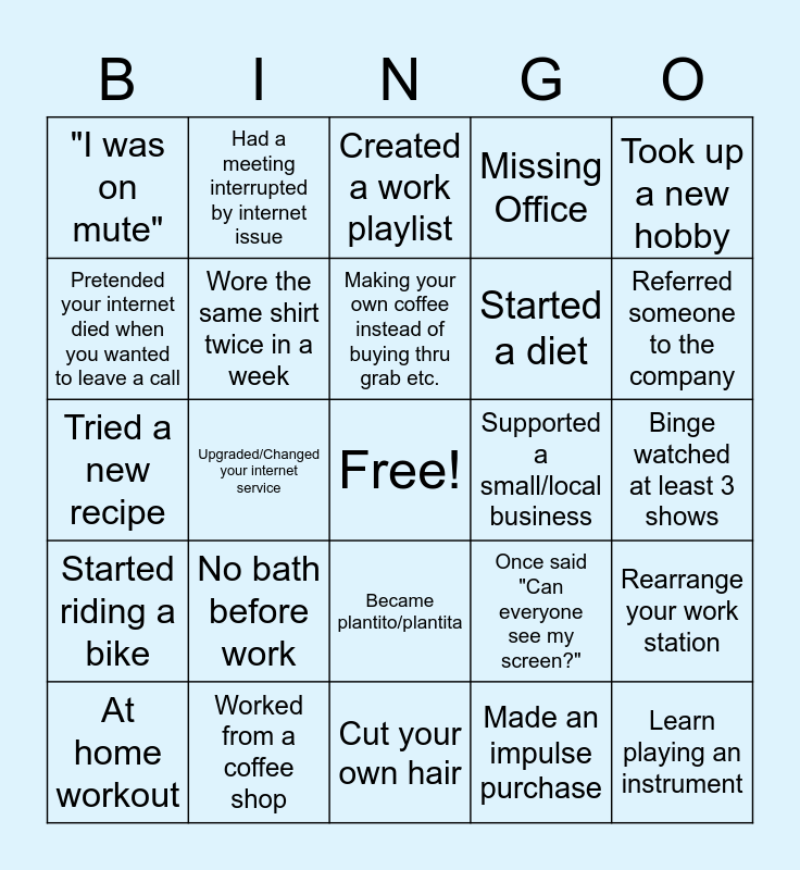 This bingo card has a free space and 24 words: At home workout, No bath before work, Making your own coffee instead of buying thru grab etc., Made an impulse purchase, Took up a new hobby, "I was on mute", Had a meeting interrupted by internet issue, Created a work playlist, Supported a small/local business, Binge watched at least 3 shows, Tried a new recipe, Wore the same shirt twice in a week, Once said "Can everyone see my screen?", Rearrange your work station, Pretended your internet died when you wanted to leave a call, Worked from a coffee shop, Cut your own hair, Missing Office, Referred someone to the company, Started riding a bike, Upgraded/Changed your internet service, Became plantito/plantita, Started a diet and Learn playing an instrument.