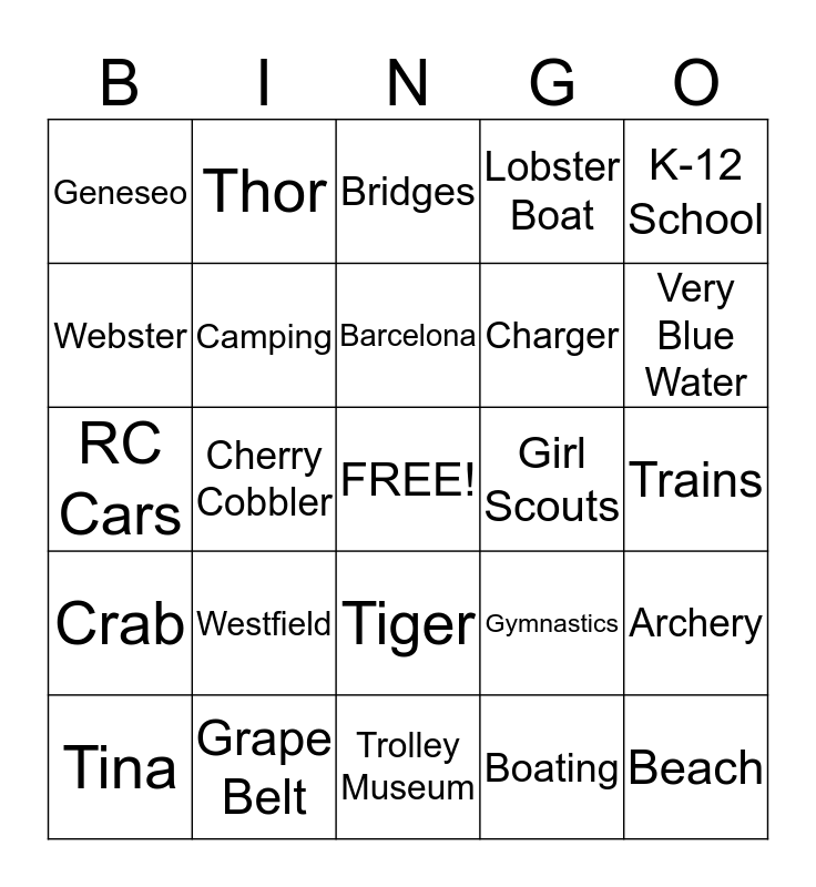 This bingo card has a free space and 24 words: Westfield, Grape Belt, Barcelona, Tina, K-12 School, Geneseo, Webster, Thor, Girl Scouts, Tiger, Charger, RC Cars, Gymnastics, Archery, Camping, Boating, Trains, Bridges, Very Blue Water, Cherry Cobbler, Beach, Crab, Lobster Boat and Trolley Museum.