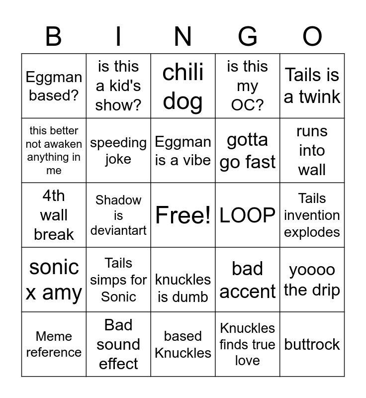This bingo card has a free space and 24 words: Tails simps for Sonic, Bad sound effect, Eggman is a vibe, Meme reference, Tails is a twink, Eggman based?, this better not awaken anything in me, is this a kid's show?, LOOP, knuckles is dumb, gotta go fast, 4th wall break, bad accent, yoooo the drip, speeding joke, Knuckles finds true love, Tails invention explodes, chili dog, runs into wall, Shadow is deviantart, buttrock, sonic x amy, is this my OC? and based Knuckles.