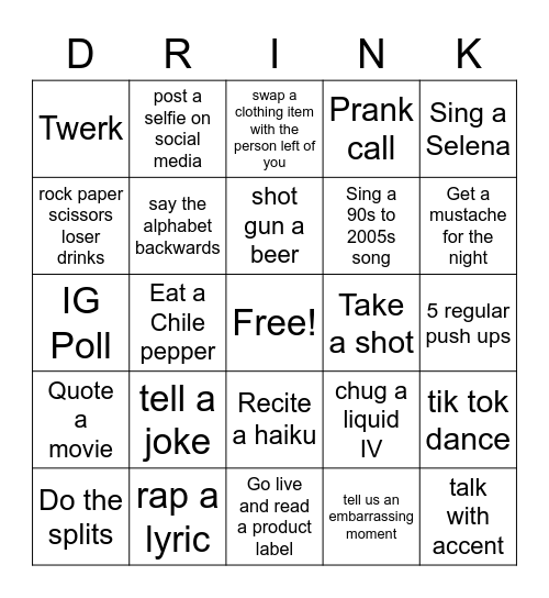 This bingo card has a free space and 24 words: tell a joke, rap a lyric, shot gun a beer, Do the splits, Sing a Selena, Twerk, rock paper scissors loser drinks, post a selfie on social media, Take a shot, Recite a haiku, Sing a 90s to 2005s song, IG Poll, chug a liquid IV, tik tok dance, say the alphabet backwards, tell us an embarrassing moment, 5 regular push ups, swap a clothing item with the person left of you, Get a mustache for the night, Eat a Chile pepper, talk with accent, Quote a movie, Prank call and Go live and read a product label.
