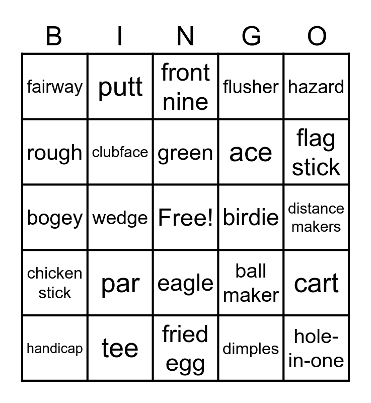 This bingo card has a free space and 24 words: par, tee, green, handicap, hazard, fairway, rough, putt, birdie, eagle, ace, bogey, ball maker, cart, clubface, dimples, distance makers, front nine, flag stick, wedge, hole-in-one, chicken stick, flusher and fried egg.