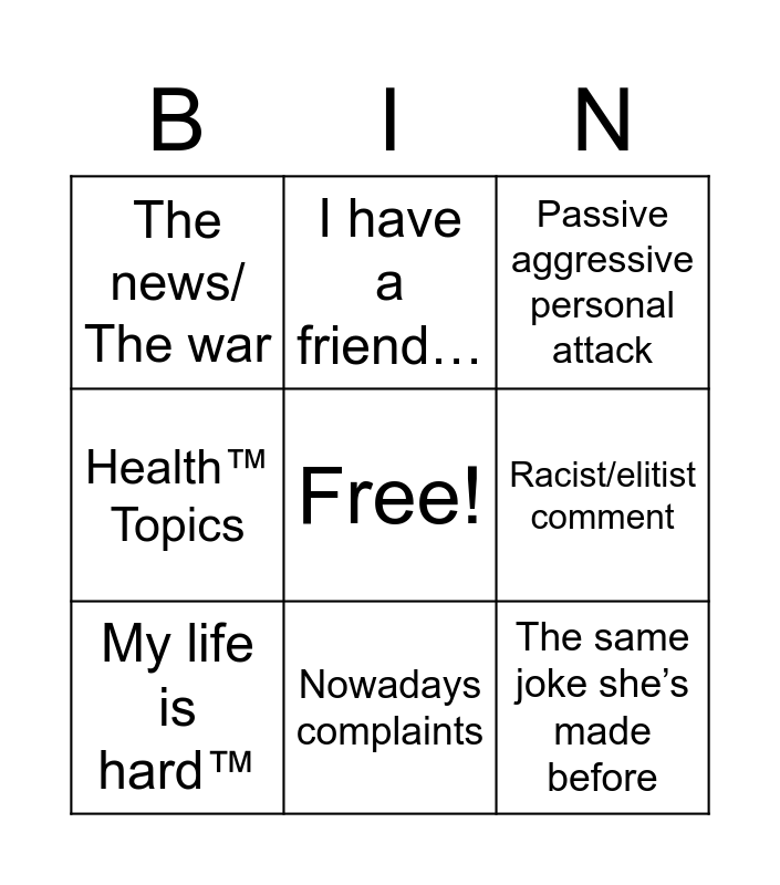 This bingo card has a free space and 8 words: Racist/elitist comment, Passive aggressive personal attack, I have a friend…, My life is hard™️, The news/ The war, The same joke she’s made before, Health™️ Topics and Nowadays complaints.