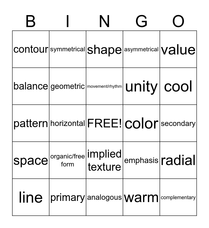 This bingo card has a free space and 29 words: line, wavy, horizontal, vertical, contour, shape, geometric, organic/free form, color, primary, secondary, complementary, analogous, warm, cool, texture, implied texture, space, value, pattern, emphasis, variety, unity, balance, asymmetrical, symmetrical, radial, movement/rhythm and proportion.