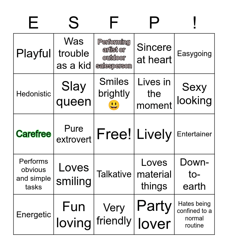 This bingo card has a free space and 24 words: Loves smiling, Fun loving, Smiles brightly 😃, Energetic, Easygoing, Playful, Hedonistic, Was trouble as a kid, Lively, Talkative, Lives in the moment, Carefree, Loves material things, Down-to-earth, Slay queen, Party lover, Entertainer, Performing artist or outdoor salesperson, Sexy looking, Pure extrovert, Hates being confined to a normal routine, Performs obvious and simple tasks, Sincere at heart and Very friendly.